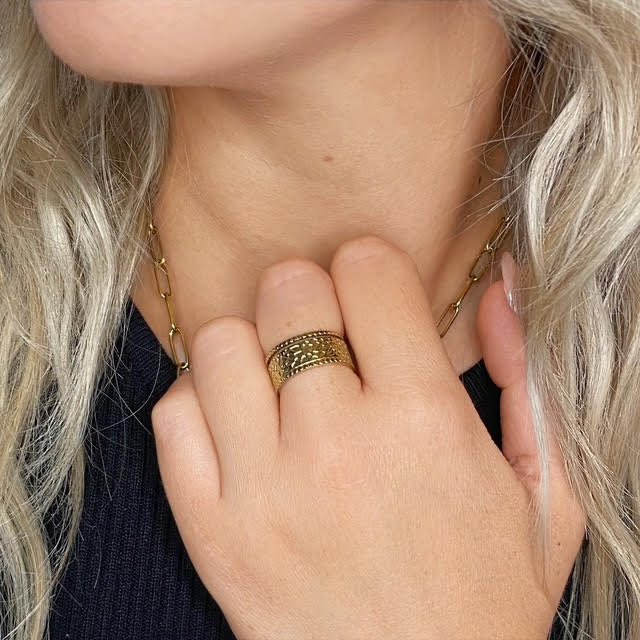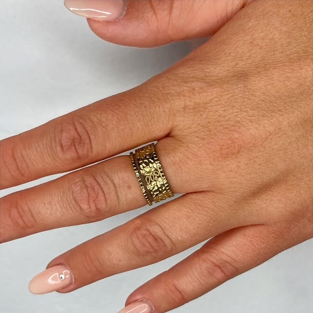 Semplicità e stile si incontrano nell'anello Oroflex. Realizzato in acciaio chirurgico, con il suo design doppio e la finitura dorata martellata, questo anello aggiunge un tocco di lusso senza eccessi. La chiusura regolabile lo rende perfetto per ogni mano, resistente all'acqua non perderà mai la sua brillantezza, mentre la sua resistenza ne garantisce l'uso quotidiano. Un must-have per chi cerca eleganza e personalità in un solo gioiello.