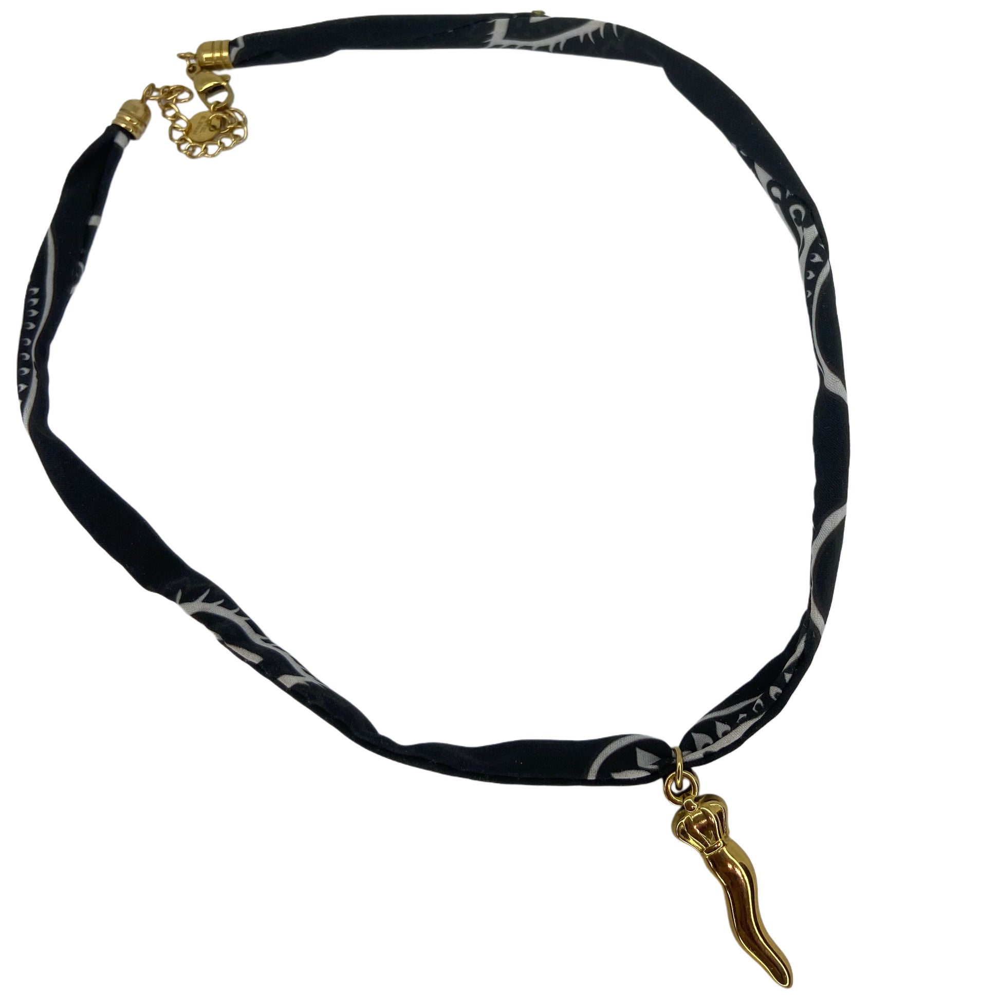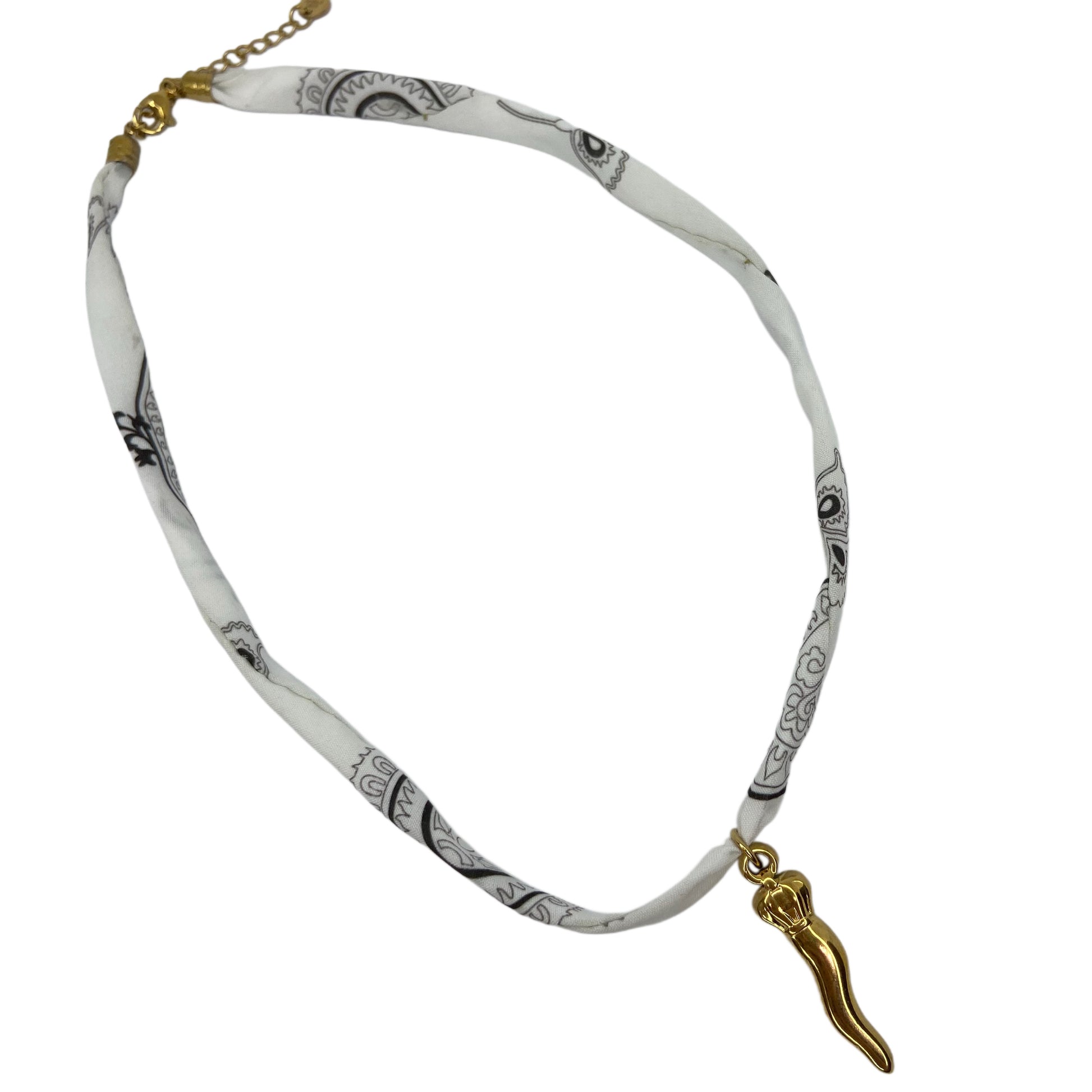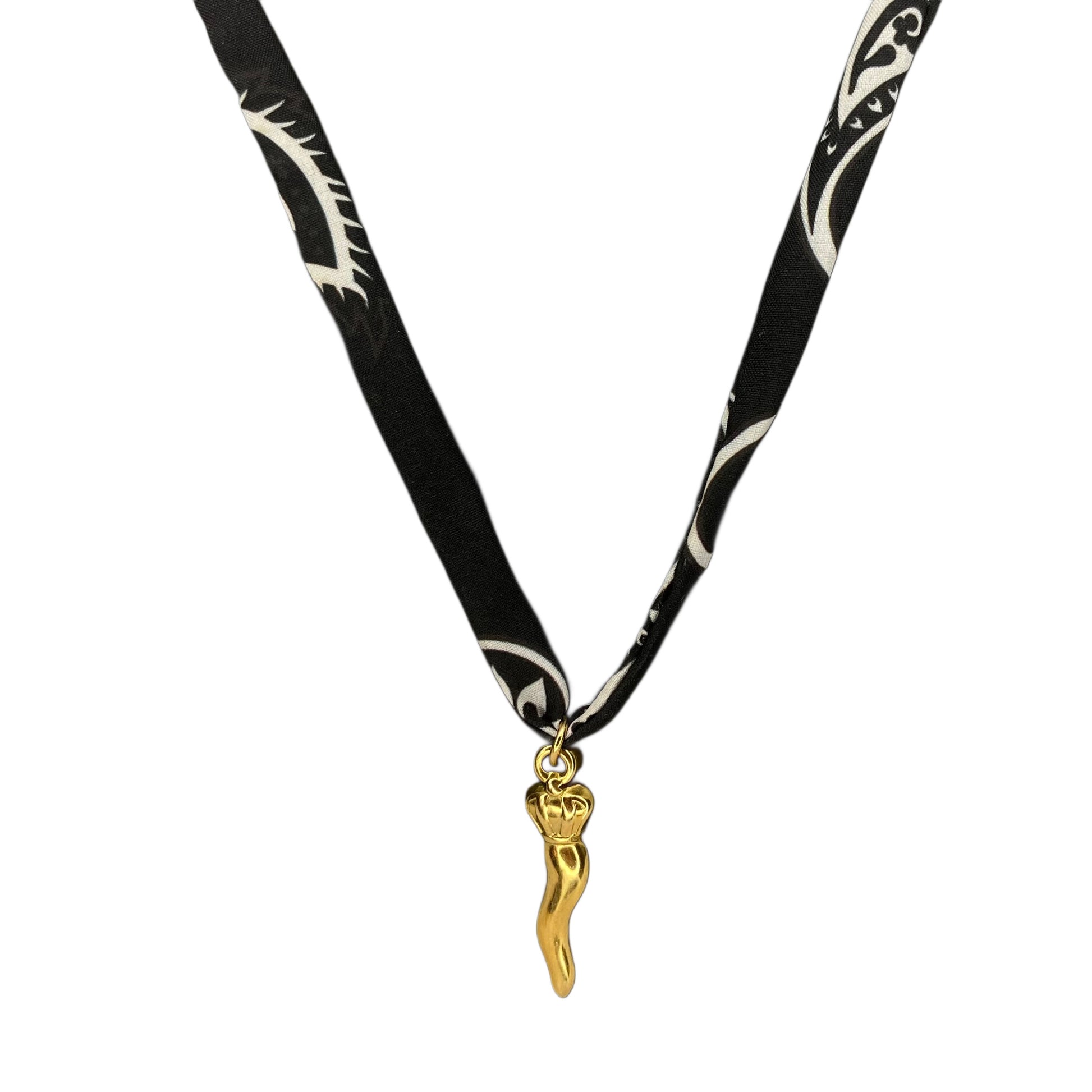 La collana Bandana è l’accessorio perfetto se vuoi aggiungere un tocco originale e di carattere al tuo look. Realizzata in morbido tessuto, disponibile in nero o in bianco con chiusura in acciaio inox, è resistente all’acqua, non annerisce e resta brillante nel tempo. Il ciondolo cornetto dorato, simbolo di fortuna e protezione, la rende ancora più speciale. Versatile, leggera e diversa dal solito: impossibile non volerla subito! 🖤🤍✨