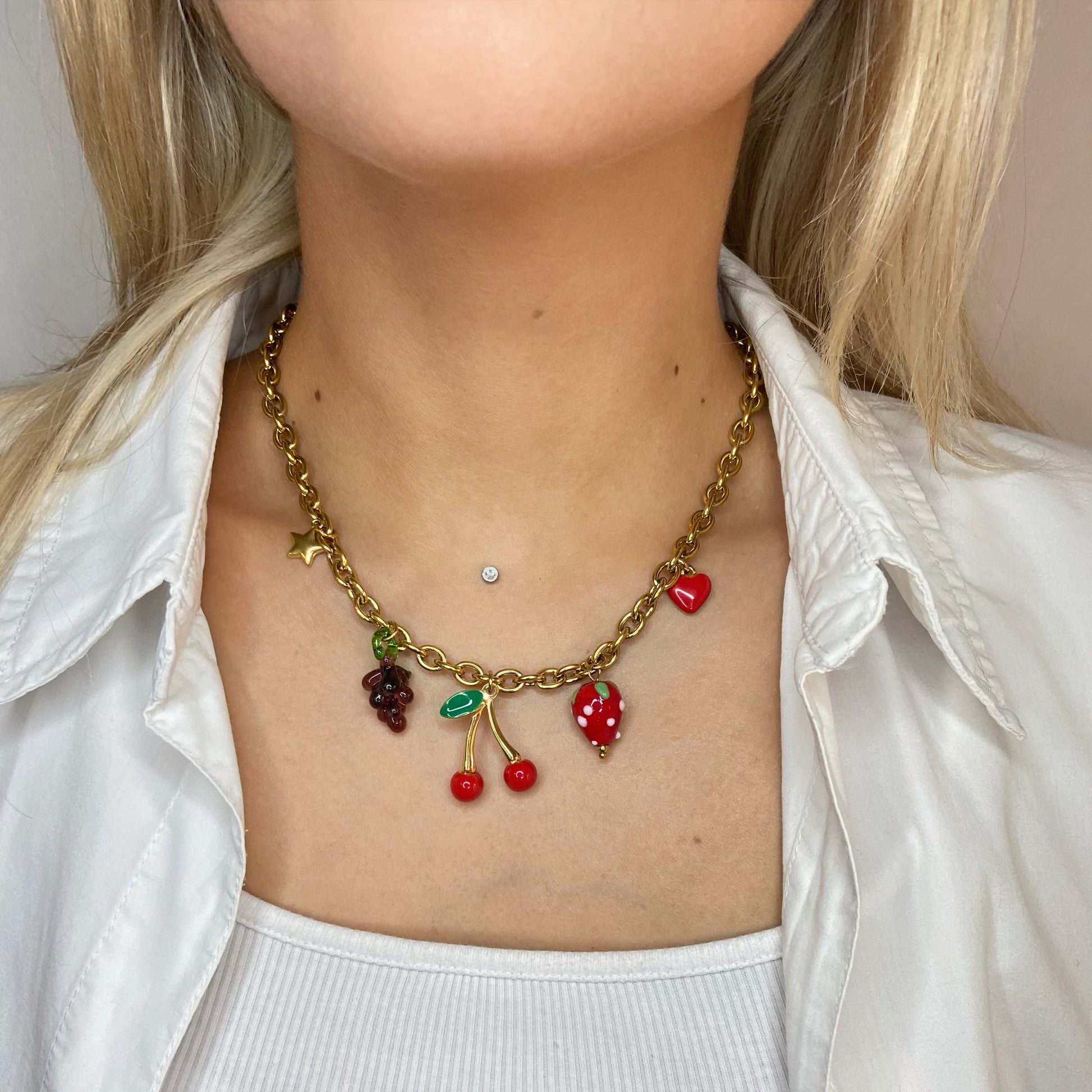 Questa collana è un esplosione di allegria: Con charms smaltati a forma di frutta, è impossibile non sorridere appena la indossi. Cherry Trap è una collana iconica: parla chiaro, anche quando il resto è minimal. Realizzata in acciaio inox, è resistente all'acqua, non annerisce così puoi portarla con te, anche sotto la doccia! Perfetta da sola o in abbinamento, per aggiungere un tocco giocoso e originale ad ogni look!