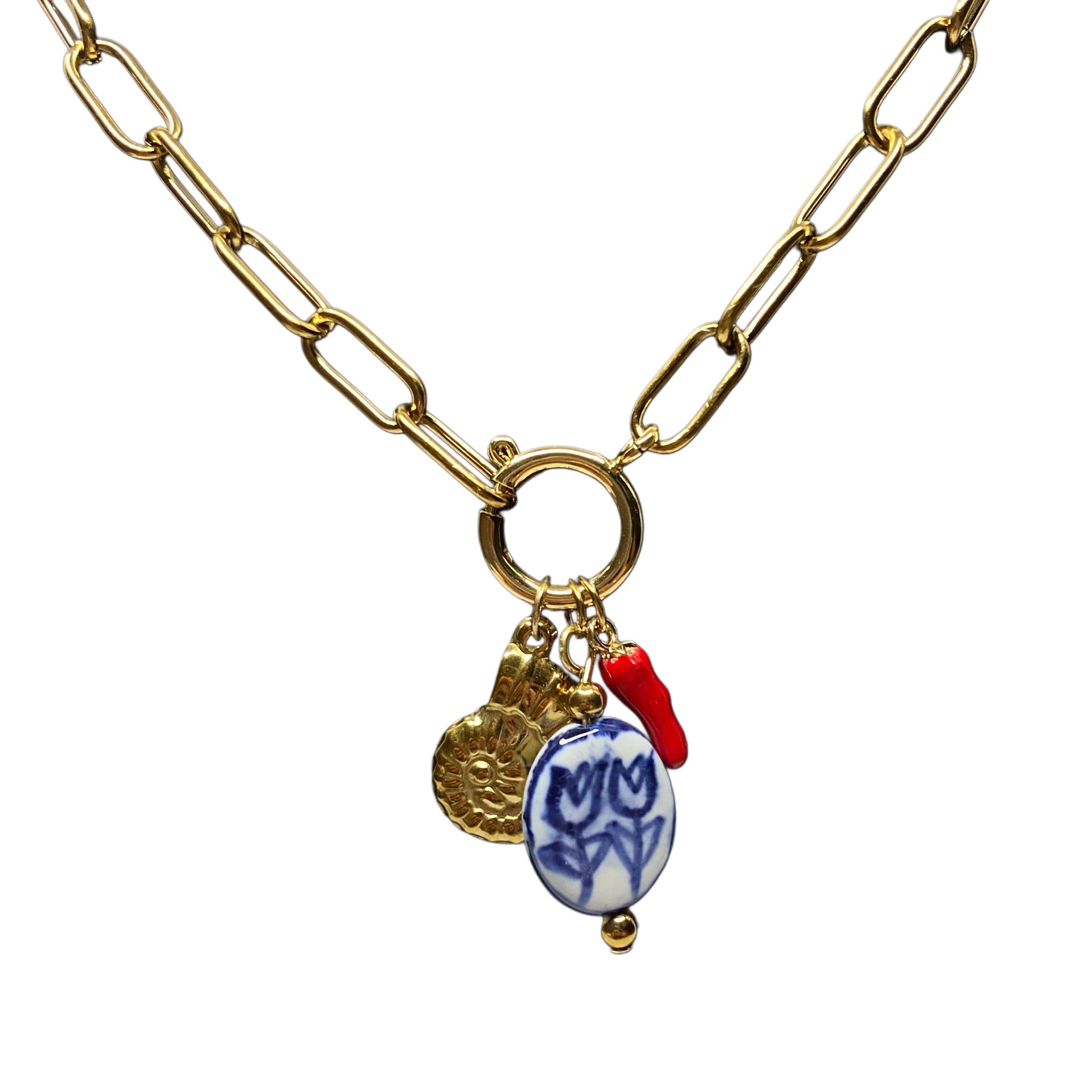 Fortuna è una collana a catena in acciaio inox dorato, dallo stile contemporaneo con richiami simbolici e mediterranei. Il design è impreziosito da tre ciondoli dal significato profondo: