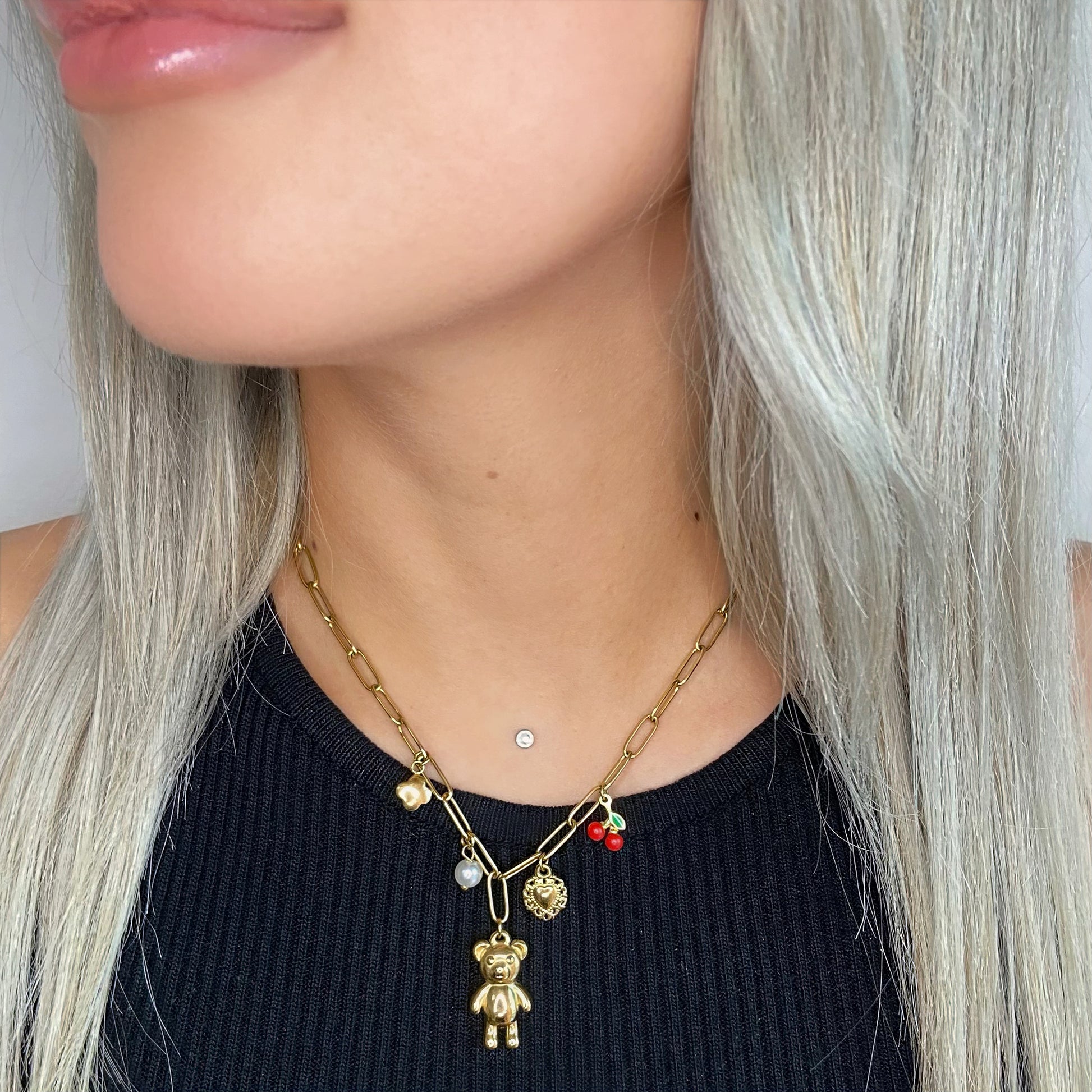 La collana Lucky Teddy è un mix di simboli portafortuna e dettagli pop, perfetta per chi ama esprimere la propria personalità con gioia e stile. Realizzata in acciaio inox dorato, è resistente all’acqua, non annerisce e resta brillante anche con l’uso quotidiano. I ciondoli dal quadrifoglio portafortuna all’orsetto giocoso, fino alle ciliegie smaltate, creano un look unico e divertente. Leggera e comoda, è ideale da indossare da sola o in layering per un tocco fresco e personale ogni giorno. 🍀🐻🍒
