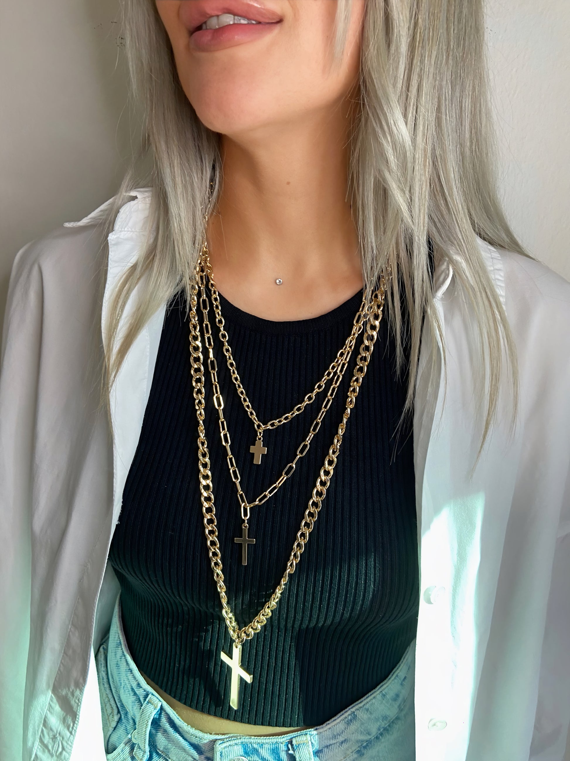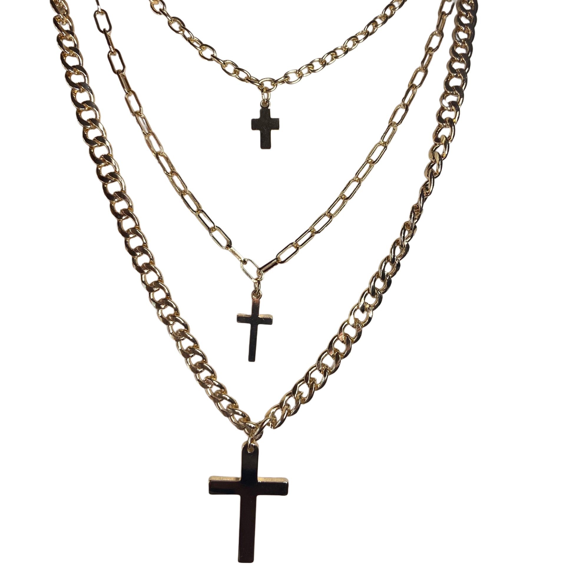 Tre catene, tre croci, un solo accessorio che fa la differenza. Tria è in acciaio chirurgico anallergico, resistente all'acqua e non annerisce: puoi indossarla sempre, senza pensieri.La chiusura a moschettone la rende pratica e comoda, perfetta per accompagnarti ogni giorno.Indossala da sola o mixala con altri gioielli, effetto wow assicurato ✨