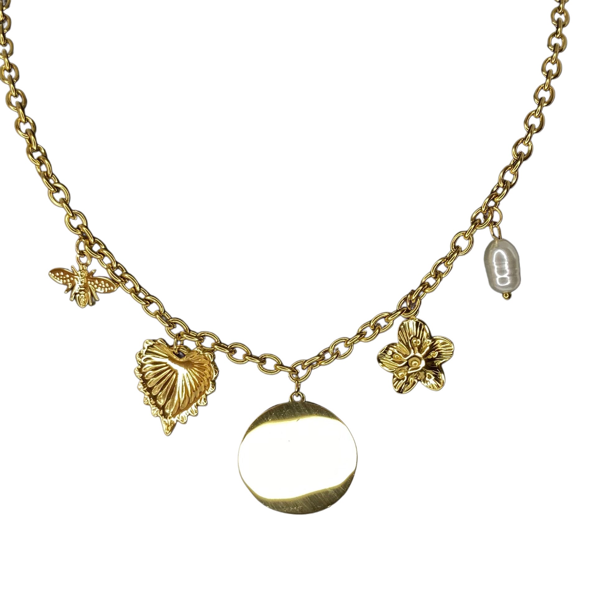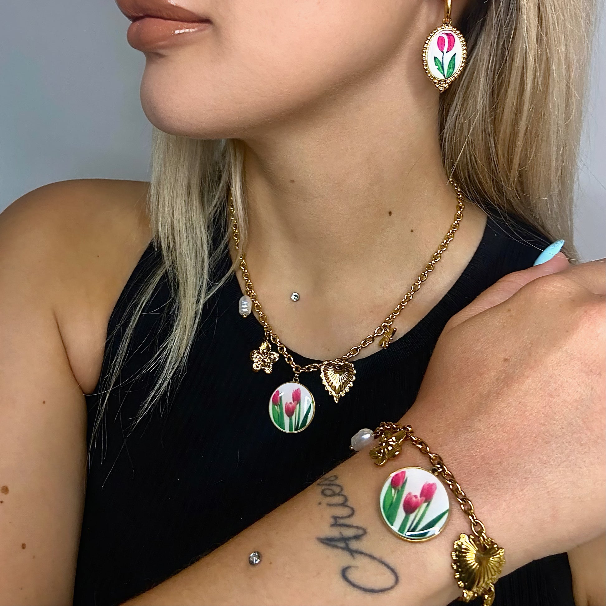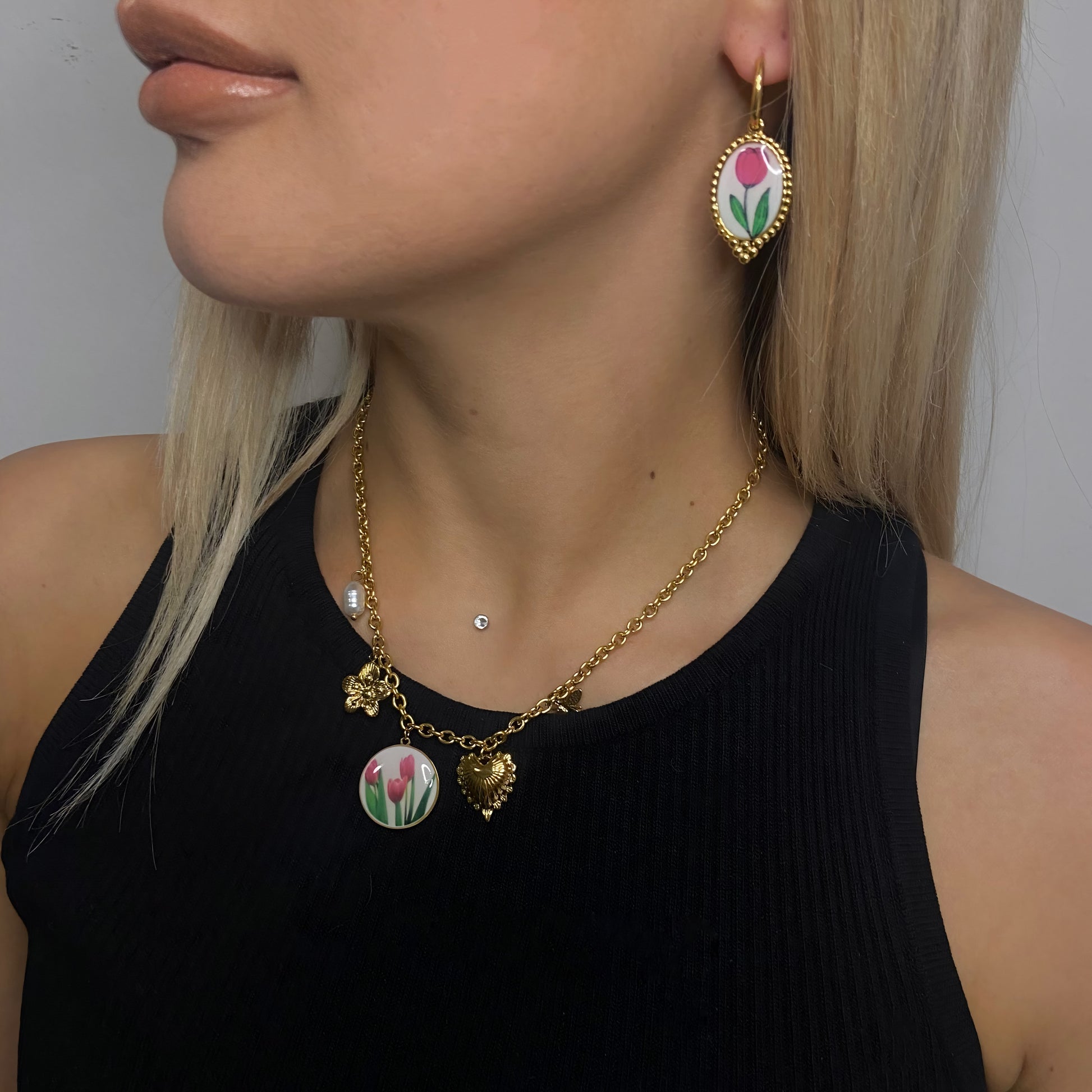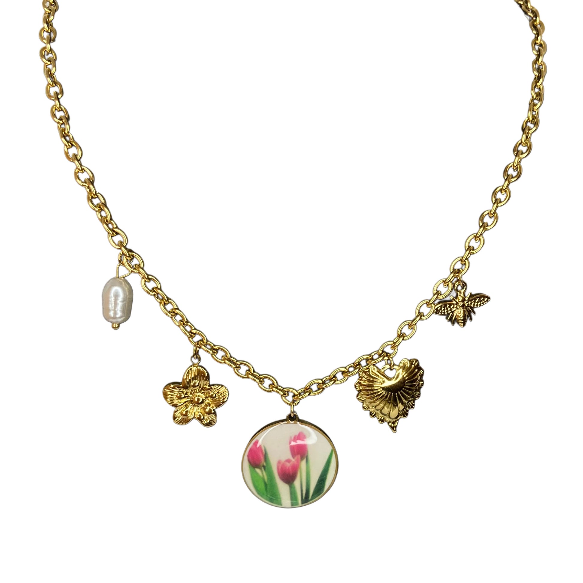 Tulipan Garden è una collana sottile ma ricca di significato, perfetta per chi ama i dettagli simbolici e lo stile romantico-contemporaneo. Tra perla barocca, fiori dorati e piccoli charm smaltati, spiccano tre tulipani rosa, cuore floreale della composizione. Realizzata in acciaio inox dorato, è resistente all’acqua, non annerisce e si chiude con moschettone. Un portafortuna prezioso da indossare ogni giorno. 🌸✨